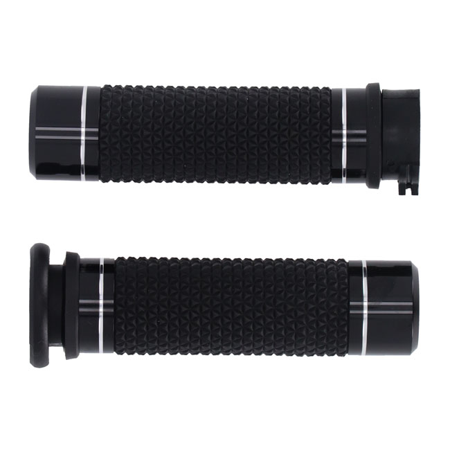 Compatible with models 1" diameter grip area. Will not fit handlebars with a 7/8" (22mm) grip area. With CNC machined billet 6061 end caps and collars. The special heavy serrated Kraton grip rubber provides a soft yet reliable non-abrasive and non-slip grip. Designed to offer better control and a more confident ride in all circumstances.