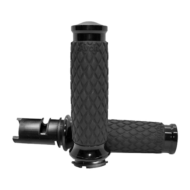 Black anodized end caps and collars. For 1" diameter handlebars. Length 11.7cm. Includes throttle sleeve. Similar to the Avon air cushioned grips; the Air-SS incorporates a system of air pockets inside the grip to dampen vibration; but Air-SS grip does not have any surface bumps but a consistent surface diameter. Complete with an grip-enhancing knurled 'Diamond' texture with 6061 billet aluminum end caps and collars. Dimensions: Inside length = 4.600" OD = 1.500"