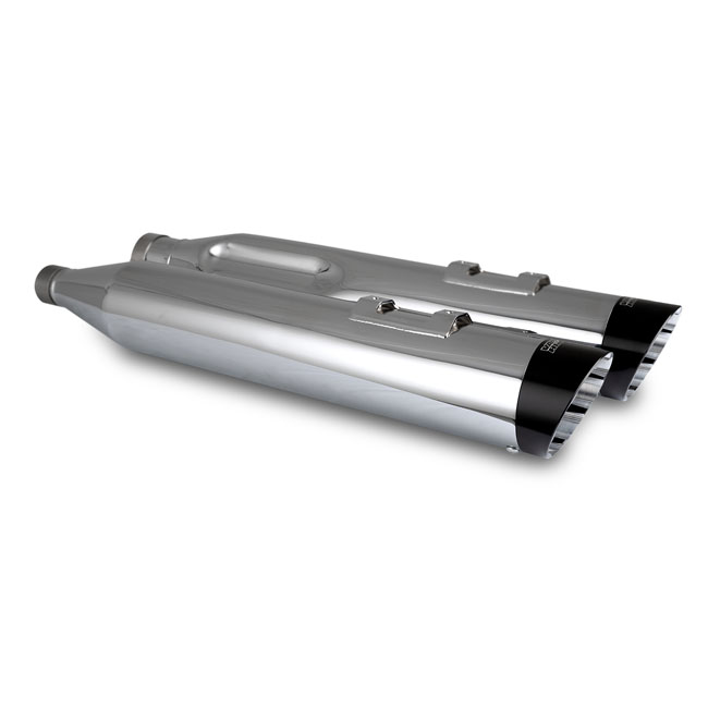 Built for riders who demand power and presence; the Razorback 450 slip-ons from Vance & Hines bring a fierce attitude with bold 4.5-inch mufflers that give your M8 bagger a deep; aggressive growl that commands attention. These slip-ons feature CNC machined billet end caps in a sharp angled design with striking contrast cuts that are convertible; allowing you to customize the look with the slash-up or slash-down angle. - Massive 4.5-inch muffler bodies - Chrome plated muffler body - End cap angle reversible up or down - Black contrast Slash Cut end caps