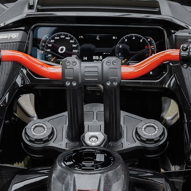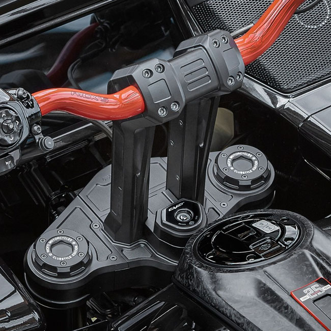 Complete with a cover for the triple tree for that 'finished clean' look. Black anodized finish. 3D CNC machined from high strength aluminum. Striking pullback Clubstyle design that will do any Clubstyle bike owner proud. Risers comes with a 1-1/4" (32mm) handlebar clamping area. This can be reduced to 1-1/8 or 1" with the optional available Rick's riser reducer kits. - Integrated cable channels; so no visible cables between the risers - Includes cover for cable channels - Works with OEM steering lock - Handlebar clamp 'Torque Bar' for optimal strength and flex control - Cable cover for triple clamp - Riser mounting screws included - With 'rigid mount' kit 4 x stainless steel bushing for no movement in the bars & ultimate control Note: When running other than 1-1/4" (32mm) handlebars at the clamping area; see Rick's riser reducer kits 709603 for 1" (25.4mm) or 709604 1-1/8" (approx. 28mm) handlebar diameter. Note: See 709564 for Rick's optional Clubstyle riser 40mm relocation plate; used to bring the handlebars 40mm closer to the rider. Compatible with Rick's risers & top triple tree cover for 23-25 CVO's and 24-25 FLTRX only (also called Gen 2 or Helix Road Glide models). Note: With risers come with approval. Check your local MCS dealer or the MCS sales department for exact type of approval and validity on bike model and years on the test report.