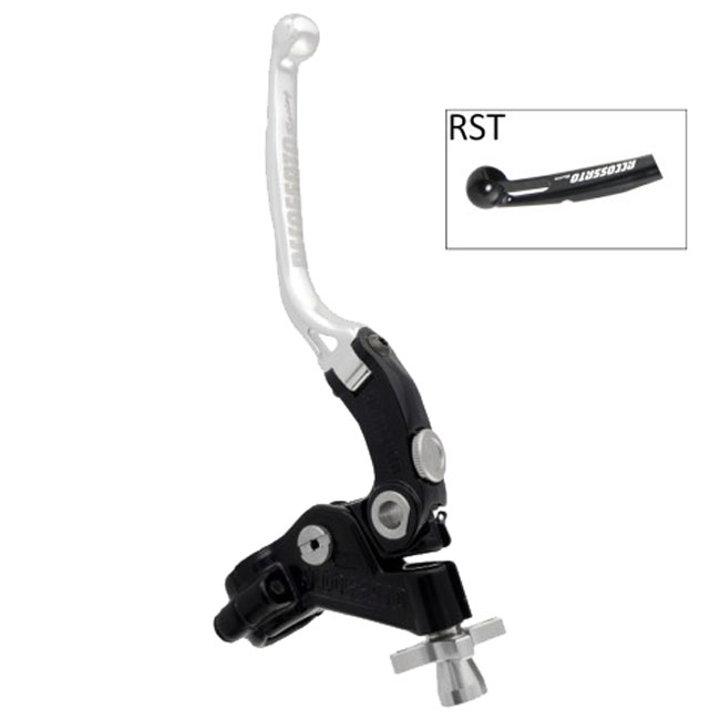 Black anodized lever assembly with a silver anodized clutch lever and cable adjuster. Folding lever comes with RST (Racing Short); so not slotted for weight reduction. For 1" (25.4mm) diameter handlebars. The Accossato Racing cable clutch 'Racing' is a patented; one-of-a-kind component designed for high-performance riders. Featuring a unique "click" cable adjustment system and the exclusive ability to adjust the distance between the lever and the grip; this clutch offers unmatched customization. The folding lever is CNC-machined from anodized aluminum and available in multiple colors; with the cable adjuster matching the lever color. - Non adjustable 19mm distance for track/street use - Stainless steel hardware - Integrated micro switch - A mirror holder is separately available as 721082 for M8 or 721083 for M10 threaded mirrors - Does not include required clutch cable