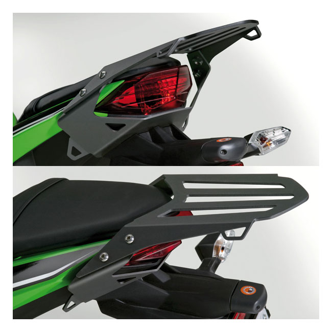 Luggage Rack designed specially for the EX300 Ninja™ to greatly improve the carrying capacity. The roomy rack surface with three bungee attachment points on each side allows riders to carry a decent sized duffel bag. The rack is made from precision; laser-cut aluminum; and the mounting bracket is made from precision cut and formed steel. Both integrate seamlessly with the lines and style of the EX300 Length: 8.25" (21.0cm) Width: 6.75" (17.1cm)