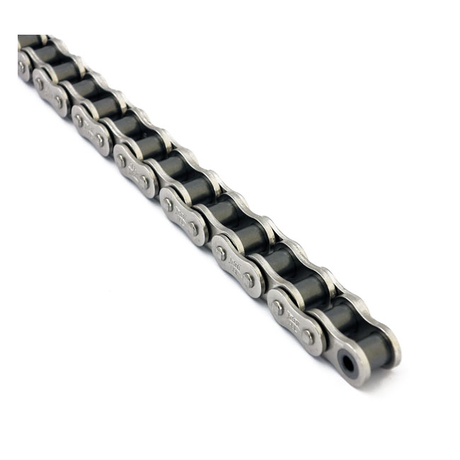 The Delta QRN Self Lube chain is nickel plated. Rated up to at least 50 horsepower. This is the self lubrication version of the Tsubaki Gamma. Bushings are impregnated with special oil. When riding the lubricant is slowly released to minimize friction and reduce wear and maintenance. Comes standard with a clip style connecting link. Average tensile strength 31.4 kN.