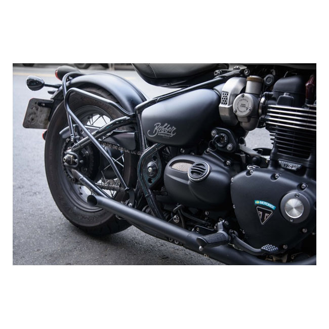 Black powder coated finish. These are called AC Pannier rails; luggage rails or saddlebag supports and used when installing saddlebags. Manufactured from 16mm diameter grade 304 stainless steel tubing with a 1.25mm wall thickness. Welds are smooth for a detailed professional finish.