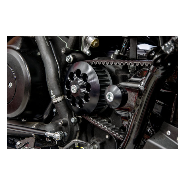 Replaces the stock plastic transmission pulley cover and pulley guard. The optional pulley guard is advised for both safety and to add better looks since the overall impression of the bike is determined by the details. The X-Spider guard comes with 3-point mount; the 4th arm serves as a belt guard / catch. Installation hardware included. Manufactured from black anodized CNC precision machined billet aluminum. Note: used with 911369 X-Spider pulley guard (must be ordered separately). Note: Comes with approval. Check your local MCS dealer or the MCS sales department for exact type of approval and validity on bike model and years on the test report.