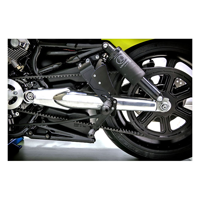 Black anodized aluminum. This will move the rider's feet back... seriously far. Great for drag racing or cool looks or anything else where an extreme rear-set controls are required. Black anodized. Note: Footpegs; shifter & brake pegs are not included but compatible with all regular custom H-D components. Note: OEM footpegs can be re-used if desired; or custom foot; brake and shift peg ordered separately. Note: Brake line must be custom fabricated for correct length. Note: Passenger pegs can no longer be used.