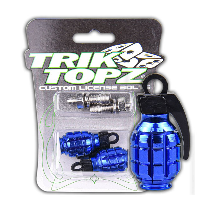 Trik Topz, Hand Grenade license plate mounts. BlueLicense plate mounts for those not afraid to attrack some attention. Don't forget to check out our style matching Trik Topz valve stem caps in our wheels chapter.