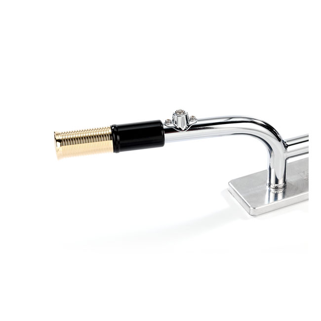 Black anodized aluminum and polished brass combination finish. Fits 1" diameter handlebars. Both left and right grip comes with 1" internal diameter for use on bikes with a custom internal throttle set-up. At Kustom Tech style is King. It clearly shows in these handlebar grip sets in which each grip consists of two separate parts; smooth for the inner and ribbed for the outer piece; for an ultra cool Kustom look. Note: Great to style match with Kustom Tech hand controls. Note: Optional ribbed grip ends; with different finishes; are separately available to make grip sets in various combination finishes. For optional ribbed grip ends see: 914956 Polished brass. 914957 Satin brass. 914958 Chrome aluminum. 914959 Polished aluminum. 914960 Satin aluminum. 914961 Black anodized aluminum. 914962 Black anodized contrast cut. Note: Compatible with Kustom Tech internal throttle systems 532031 (regular right side throttle action) and 532117 (left side throttle action).