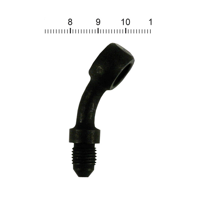 Goodridge Banjo fitting black 3/8", 20 degrees, 10mm20 degrees Banjo fitting; 10mm - 3/8". Fits straight to Goodridge brake line kits with 3/8"-24 AN-3 threaded hose ends. Black plated carbon steel.