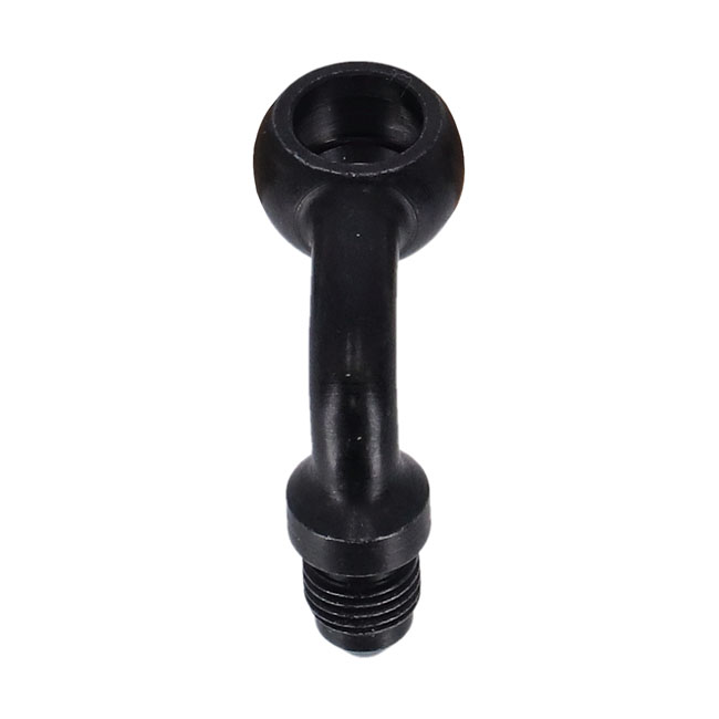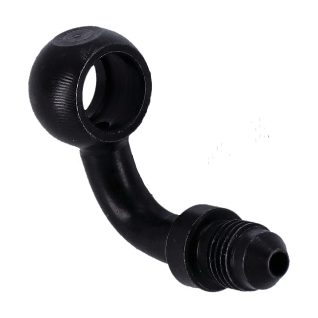 Goodridge Banjo fitting black 3/8", 90 degrees, 10mm90 degrees Banjo fitting; 10mm - 3/8". Fits straight to Goodridge brake line kits with 3/8"-24 AN-3 threaded hose ends. Black plated carbon steel.