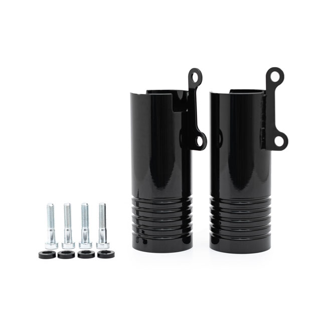 CNC machined billet aluminum with a gloss black powder coated finish. Designed to cover the lower fork tubes of the upside down fork. This transforms the fork to a massive blackout Fat Fork look. Installs directly to the caliper mounts.