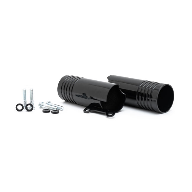 CNC machined billet aluminum with a gloss black powder coated finish. Designed to cover the lower fork tubes of the upside down fork. This transforms the fork to a massive blackout Fat Fork look. Installs directly to the caliper mounts.