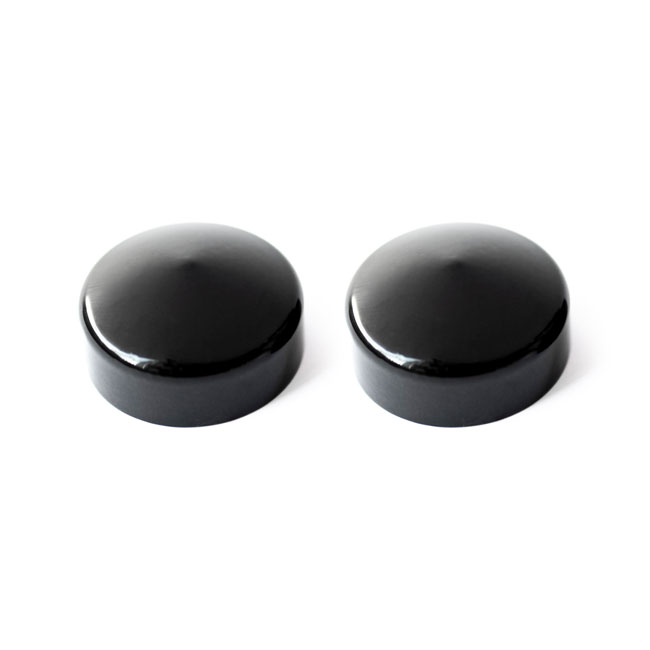 Killer Custom, fork tube cap bolt covers. Gloss blackFork tube caps to cover upper chrome bolts. Gloss black powder coated precision CNC machined billet aluminum construction. Installs with a set-screw.
