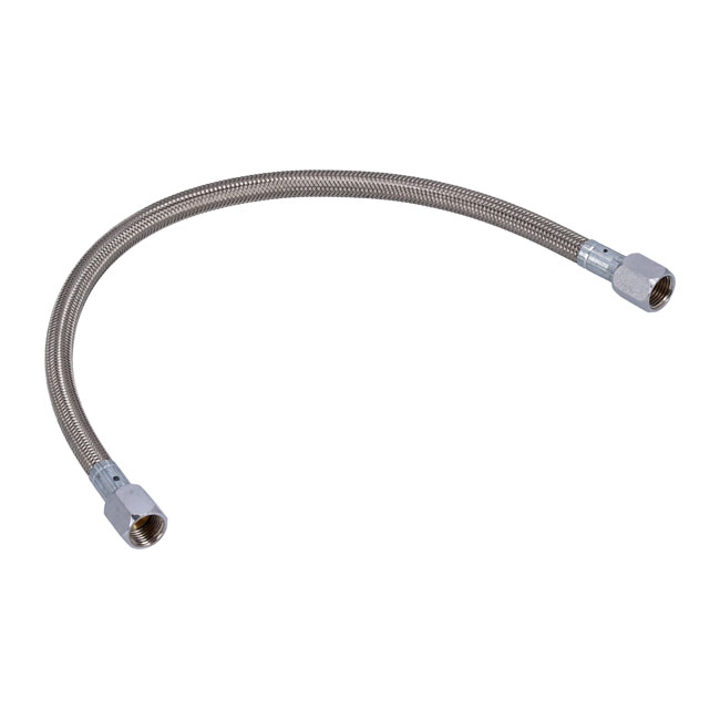 This is a pre-assembled stainless braided oil line in fixed length; with female swivel fittings installed. Used in Pre-Twin Cam applications in stock or custom applications. Just purchase the correct length oil line; plus the right oil line fittings for your application; and you'll have a set of oil lines to challenge all others in quality; fit and finish. Comes with braided steel outer and PTFE lined inner hose. Note: Oil line has highly polished stainless steel -6 JIC swivel fittings pre-installed and will fit the oil line fittings mentioned below. Note: Oil line length mentioned is the distance between the internal flares of the female swivel fitting. Actual overall length of the hose is 2" longer than mentioned. Note: Oil line fittings are highly polished stainless steel. With -6 JIC connection; on oil line side and a 1/8" NPT (approx. 10mm in diameter; as in oil tank and oil pump) or 1/4" NPT (approx. 13.5mm in diameter) thread to fit regular H-D applications. Order oil line fittings separately as required: - 921912 1/8" straight - 921913 1/4" Straight - 921914 1/8" 45° - 921915 1/4" 45° - 921916 1/8" 90°