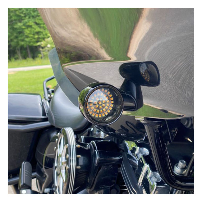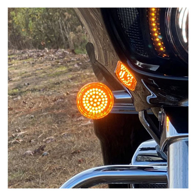 Smoke lens. Amber & white LEDs. Custom Dynamics® Genesis® Dynamic Ringz®. For front use with dual filament 1157 lamp base. Fits turn signals that are equipped with a dual filament (1157 lamp base). Will not fit EU models unless custom converted to a 1157 dual filament lamp base. Comes with a total of 48 super bright dual color amber and 6000K white daylight driving LEDs on a black circuit board. When the turn signal is activated the white LEDs turn off for better visibility of the amber turn signal. DOT and SAE compliant. Installation and wiring instructions included. Note: Will not fit EU models and any CVO™ models.