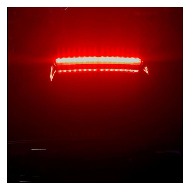 LED light unit to mount to the top of your Tour-Pak®. Adds 32 run/brake LEDs and 16 LEDs per side for the red turn signal. The Light unit comes pre-taped for a peel & stick application to the top of King & Chopped style Tour Paks®. Includes plug and play wiring harness for simple installation.