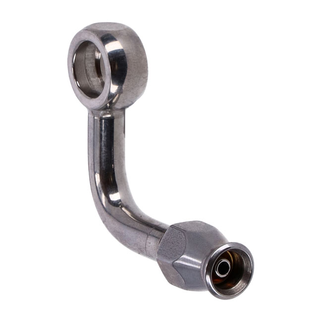 Goodridge, 3/8" (10mm) banjo fitting 90 degree side bendHigh polished stainless steel. Used in combination with Goodridge Build-A-Line brake lines. These fittings are installed on one or both ends of the brake line.