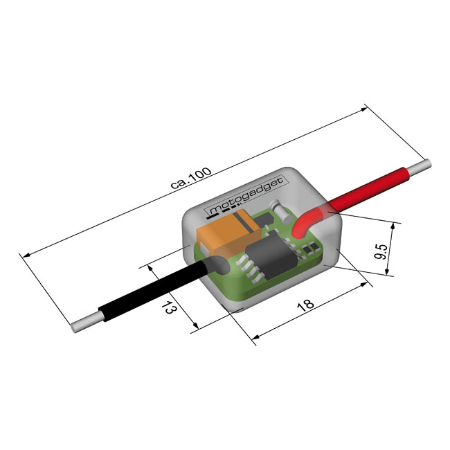 With built-in load equalizer. Offers a constant flash-rate with any number of LED or incandescent (bulb) turn signals. Short circuit protected. Works from 5 to 18 Volt. Ultra small & light with a weight of just 4 grams. Dimensions of just 13mm long x 18mm wide x 9.5mm high (about finger nail sized).