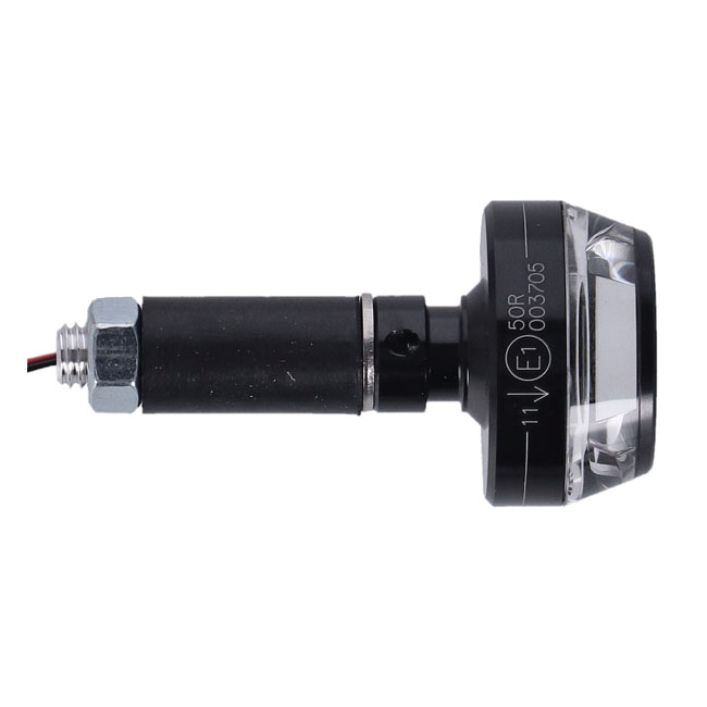 Black anodized finish. Clear lens. Universal handlebar installed turn signals with Power LED performance. Special 360° lighting effect through the clear transparent glass-like material in combination with a power LED. Essentially a transparent light disc on a aluminum base and ECE approved for front use. Diameter 35mm; OAL 68mm; Inside bar 48mm; outside bar 20mm; wiring length 100cm. Fits all 22mm and 1" handlebars with an Inside diameter of 14mm to 21mm. With 7W power LEDs.