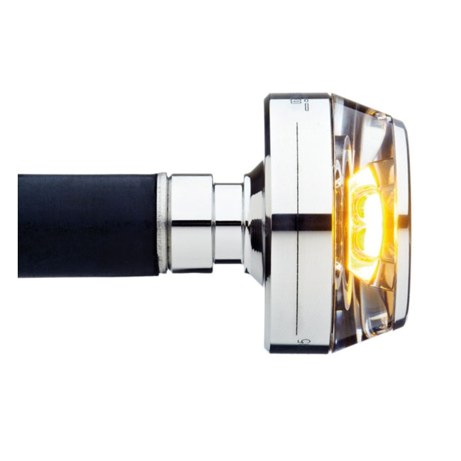 Polished. Clear lens. Universal handlebar installed turn signals with Power LED performance. Special 360° lighting effect through the clear transparent glass-like material in combination with a power LED. Essentially a transparent light disc on a aluminum base and ECE approved for front use. Diameter 35mm; OAL 68mm; Inside bar 48mm; outside bar 20mm; wiring length 100cm. Fits all 22mm and 1" handlebars with an Inside diameter of 14mm to 21mm. With 7W power LEDs.