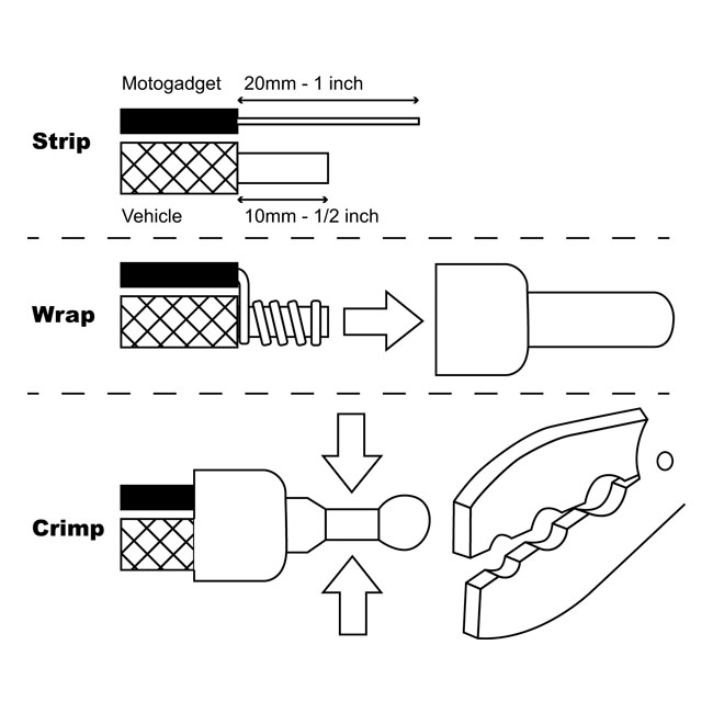 Motogadget, cable-end crimp connector setSimple and quick way to make a strong and positive connection of an electrical wire onto an existing wire-end. Inside crimp ring diameter 2mm; overall length 18mm.