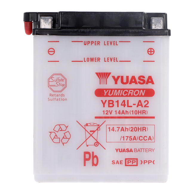 Yuasa, Yumicron battery YB14L-A2Engineered to protect against corrosion; withstand vibration and deliver more cranking power to your motorcycle.