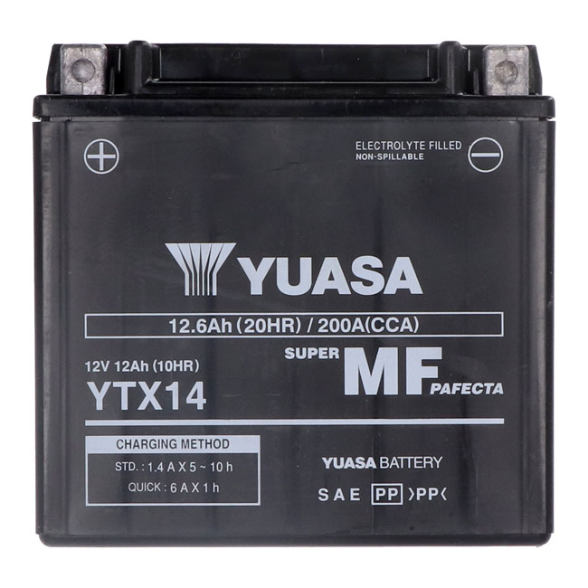 Yuasa, AGM battery, YTX14-WCYuasa’s elite performer; the AGM (Absorbent Glass Mat) series; has more cranking amps and higher amp hour capacity for years of trustworthy service.