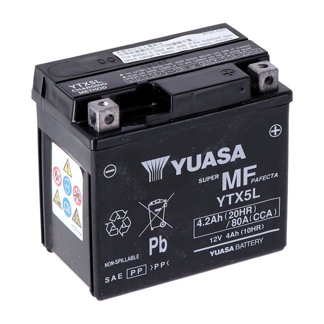 Yuasa, AGM battery, YTX5L-WCYuasa’s elite performer; the AGM (Absorbent Glass Mat) series; has more cranking amps and higher amp hour capacity for years of trustworthy service.
