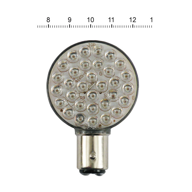 'Lollipop' flat LED taillight & turn signal bulb. RedDual filament. Replaces 1157 (dual filament with brake light) light bulbs. Built with 32 LEDs. Dimensions: diameter of round LED holder approx. 43mm.