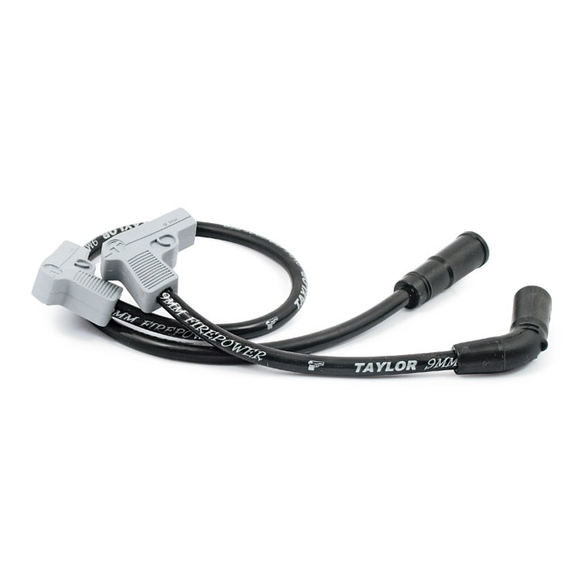 Includes one 18" wire with 90° plug and 180° (straight) coil boot. The other wire is 9" with 90° plug boot and a 90° coil boot. Compatible with all H-D ignition systems; both points and electronic. The 9mm Fire Power wires come with the core of the ThunderVolts; according to Taylor these are the best wires money can buy. The 25 ohm/ft. ferrite spiral core is made with a blend of copper nickel alloy which is bonded by a conductive acrylic cover. Taylor claims more horsepower; more torque and better mileage. With the silver metallic plug boots styled after a 9mm pistol it gives a very distinctive look. Note: Some electronic ignition manufacturers do not recommend using spiral wound core cables. Check the instruction manual of your electronic ignition module for more information. When in doubt it is advised to use suppression core cables for electronic ignition set-ups.