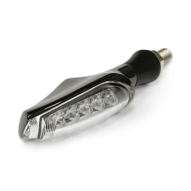 Matte black body with E-approved clear lens with amber LEDs. - Metal body - Clear lens - 12V/0.5W - Body: 24mm deep x 20mm high x 64mm long - Rubber stem 27mm long - M8 x 1.25 threaded 20mm long - Includes wiring - E-approved for front & rear use