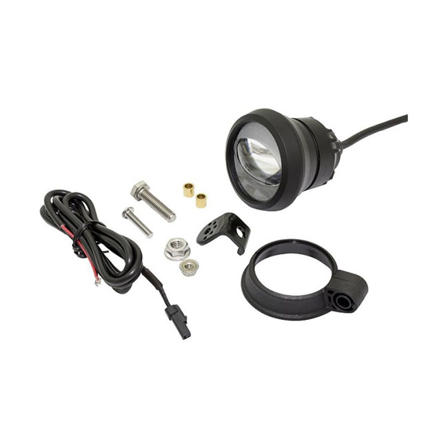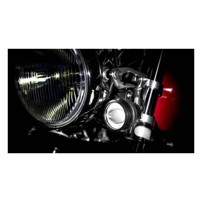 Includes 2 fog lights with installation hardware. Black with bell shaped aluminum housing. The power LED provides low amperage draw; 0.54A@12.6V = ca. 6.8W. Easy installation with one red (+) and one black (-) wire. . - Diameter 53mm diameter - Depth 63mm - Total height with bracket 71mm - Wire length with connector 140mm - 0.54A@12.6V (ca. 6.8W) - 14400 lumen - E approved: E4-19R-04190525 - Kit includes: 2 Aurora LED fog lights; 2 x bracket; 1 x Y-cable ca. 1000 mm; 2 x L-Typ hanger; 4 x capsules; 2 x M6 x25 mm + nut; 2 x M4 x20 mm + nut.