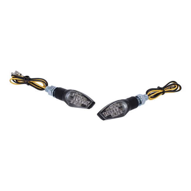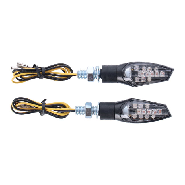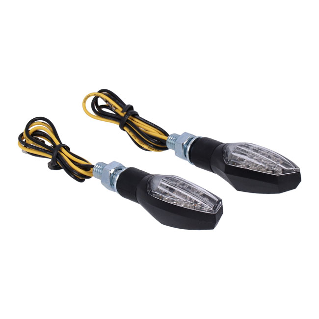 Nova, LED turn signal set. BlackBlack housing with LED lighting. ECE approved clear lens. Dimensions approx. 47mm wide x 20mm high x 21mm deep. Stem length 12mm. M8 threaded.