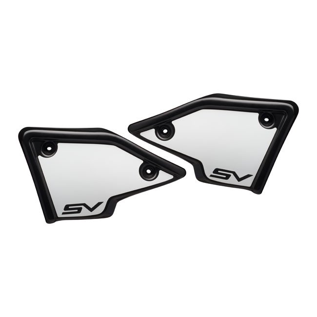 C-Racer, side number plates. Black glossMade of unpainted black ABS plastic. Comes complete with white stickers; installation hardware and detailed installation instructions.