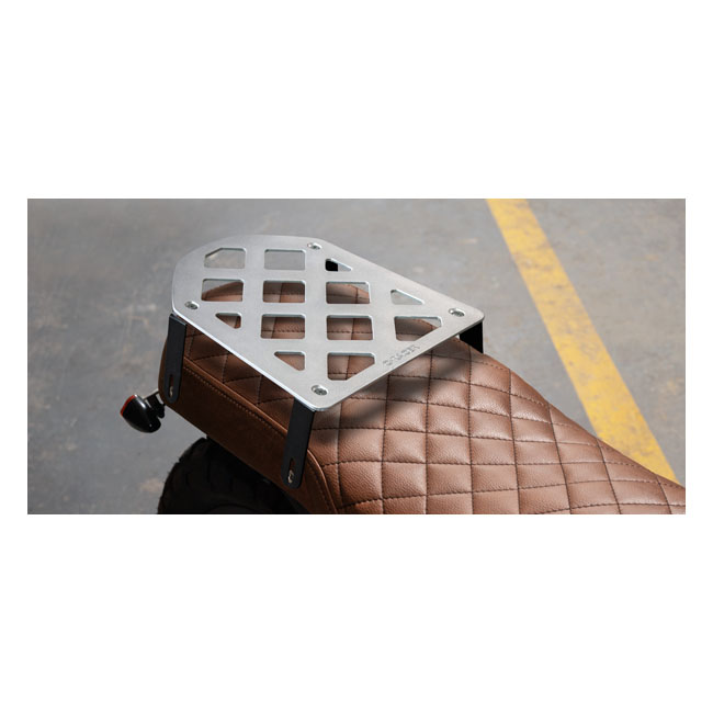 Silver/Black electrostatic painted. Specifically designed for use with C-Racer's 950751 (black) or 950752 (brown) seat only. This small luggage rack is placed over the back (passenger) section of the seat; therefore carrying a passenger is no longer possible. Converting back to passenger mode is simple & quick since it installs; or removes; with just 4 screws. Made from 4mm thick aluminum with 3mm thick steel mounting brackets. Maximum luggage weight is 10kg. Complete with installation hardware and instructions.