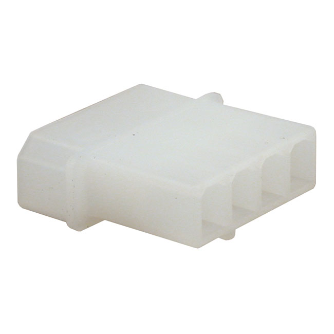 Housing for male terminal pins. This is the non-sealed AMP OEM 1st. series electrical connector style as used on most H-D 71-95 models. Excellent choice for an OEM style restauration. Note: 502465 male crimp-on stamped terminal pins must be ordered separately. Note: See 951218 for the compatible 4-pins plug connector with female pins.