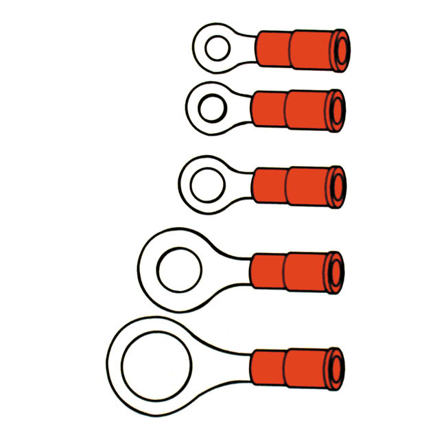 Connectors, ring terminal PVC, crimp. Red 6.35mmStud 1/4" (6.35mm). For 22-18 gauge (0.50 to 1mm² or 0.64 to 1.02mm diameter) wiring.
