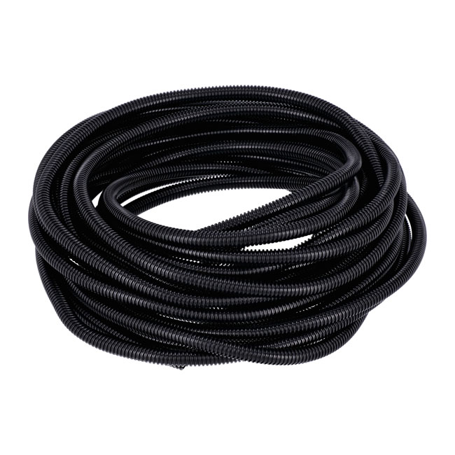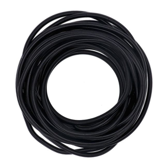 PVC split wiring loom. 50ft, 3/8" I.D. (9.53mm). BlackWith a 'split seam' which allows easy installation; without disconnecting the wiring. Protects against abrasion and heat. Temperature range -15°F (-26°C) and +195°F (91°C).