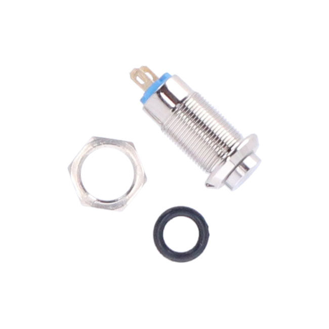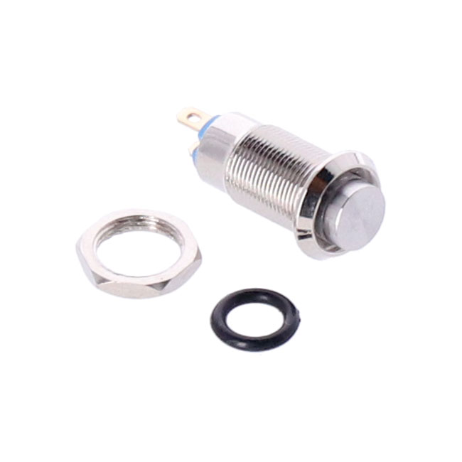 Stainless steel on/off switch in push button style; 8mm threaded. Small; discrete and not just perfect to operate Axel Joost Elektronik components. Can be installed directly into the handlebar or virtually any other place. Perfectly compatible with gloves.