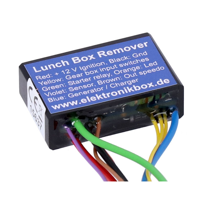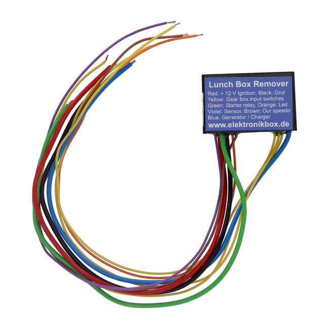 This module is used to simplify removal of the standard "lunchbox" speedometer instrument and its original bulky harness. The Lunchbox Remover module has an integrated neutral switch control with an output for the starter relay and the neutral indicator LED. A virtual load resistor for the charging system is built-in and the signal from the speed sensor is boosted from 0.2 Volt to 8 Volt to for compatibility with most aftermarket speedometers for your bike. - Dimensions: 41 mm length x 26 mm wide x 12;5 mm height - Body material: Shock resistant ABS plastic; waterproof poured raisin - Case color: Black - Connections: 0.14 qmm; 20 cm - Maximum ambient temperature: 80 degree Celsius - Input voltage range: 7 - 18 Volt