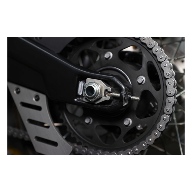 Replaces the stock chain adjusters / axle adjusters / wheel adjusters. Made of 6061 aluminum with a hard anodized finish for strength and durability. Gives your bike the look it should have had from the factory. The left hand side holds the rear axle nut to keep it from turning for an easy removal of the rear wheel. - Replaces the stock chain adjusters - Made of 6061-T6 aluminum - Hard anodized stealth gray finish - Prevents the axle nut on the left side from turning**Dynojet product not available to purchase by Dealers located in the UK**