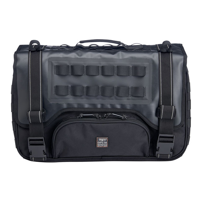 Full size EXFIL-36 holds thirty six 12-ounce beer cans. These EXFIL saddlebags sets handle business with the same smart design and rugged construction as every bag in the Biltwell moto luggage arsenal. This is a throw-over saddlebag set that comes as a left & right bag. The center section; equipped with velcro; is placed over your fender and under your seat. The saddlebags are simply zippered to the center section. On the backside of the bags a mesh strip slides behind any universal saddlebags support (saddlebag supports are sold separately) to which the bags can be attached with the attached strips; D-rings or use the molle attachment points that are found on the front and back of the bags allow you to attach the bags firmly to the saddlebag supports and additional gear to the bags. Inside the bag you'll find a large bright orange (helps to find things quicker) compartment; a separate flat slide-in zippered compartment for laptops or so on the backside and on top a zippered flat slide-in compartment for vehicle documents; smartphones or other flat objects that must be easy accessible. The hidden cable port into main compartment is perfect for charging devices. Waterproof nylon rain covers with elastic gathers and drawstring closure provide extra protection in extreme conditions. Strong; flexible EVA foam panels inside main compartment add structure and durability. UV-treated 1680-denier ballistic nylon exterior resists moisture and fading. These are good for the long haul.
