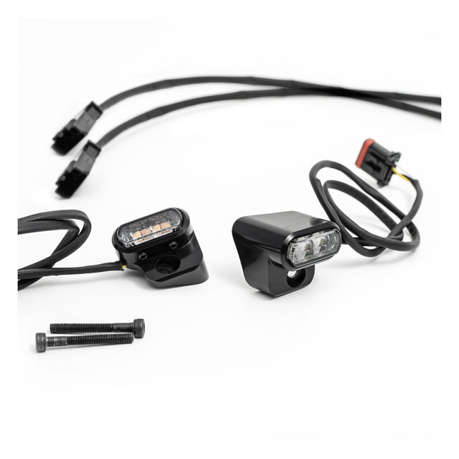 No DRL (Daytime Running Lights) function. Bolt-on; black anodized plug-in turn front signals that fit the front side of the switch housings. Longer wiring harnesses with connectors are included for easy installation; also with higher handlebars. Virtually invisible until activated. Comes with ECE approved lights and comprehensive legal documentation; affirming its suitability for road use and compliance with regulatory standards for a safe and no-hassle ride.