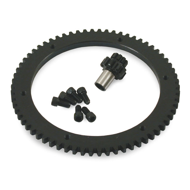 Converts from 102 tooth to 66 tooth. Consists of a starter gear and starter ring gear. Can be used with all Spyke starter motors. Will convert from the standard 94-06 102 tooth to the earlier ring gear design with 66 tooth. The early 66 tooth design will withstand high torque starters; large displacement & high compression engines better than the late 102 tooth design.