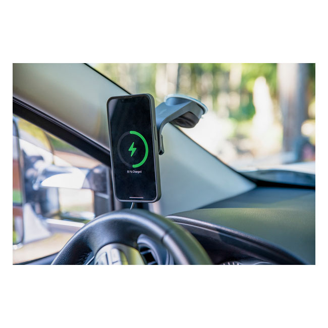 SPC+ style phone case mount compatible only. Suction cup mount for magnetic attachment of your SPC+ Phone Case with inductive charging function. Securely installs to any flat non-porous surface like glass etc. by pressing the lever. The phone is securely held in place by powerful magnets. - Vibration free car suction cup mount - Magnetic attachment of the SPC+ Phone Case - Fast inductive charging with 15 watts of power - Super-stable 360° adjustment - Dimensions: 70(W) x 101(H) x 150(D) mm - Weight 148 grams. Includes: - 1 × Charging Suction Mount SPC+ - 1 × Cable USB-C/USB-C (PD & QC 3.0)
