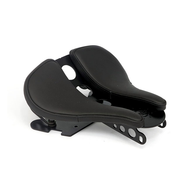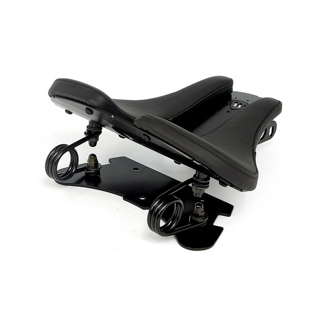 With one-piece seat. Gloss black powder coated steel construction. Includes the frame mount plate; early scissor style seat springs and a seat with a 2-piece genuine leather upholstery. The steam-punk orientated styling gives it the right retro touch and is guaranteed to lift your bike to new custom levels. Note: Great style-combo with the Cult-Werk swingarm mounted fenders. Note: For the optional Cult-Werk ABS frame cover see 963105 (short) or 963104 (long; up to the shocks).