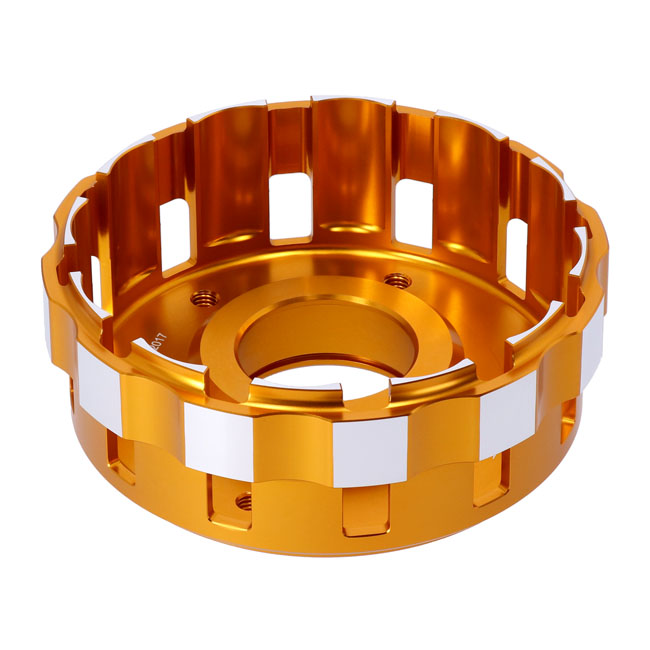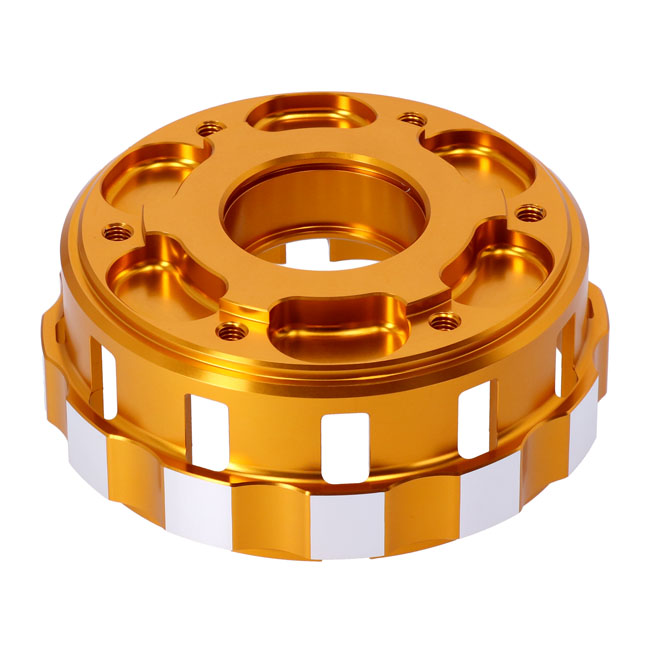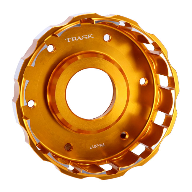 Gold colored hard anodized for added durability. Don't wait for the OEM basket to snap on you. This Trask Performance clutch basket is much stronger but fits as a direct replacement for the OEM basket. Trask recommends these for any engine with over 100HP and they'll handle blown motors with over 300HP. Hard anodized CNC machined billet aluminum construction. Includes mounting bolts and lock tabs.