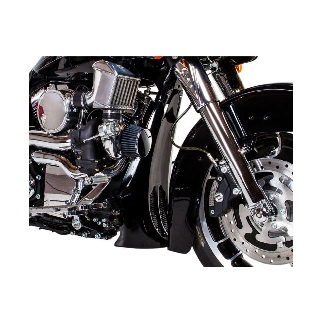 Used with raked forks. The Trask Performance chin spoiler adds a subtle suggestion of speed; without overdoing it. A perfect add-on for any natural aspirated or blown Power Bagger; even perfect for standard Tourings to show your Trask genes. Made of hand-laid unpainted gray gel coated fiberglass. Includes stainless mesh inserts and all required hardware. Raked dimensions approx.: 19.5" (49.5cm) high x 11" (28cm) wide x 9" (22.9cm) deep. Note: Will fit Touring models with OEM oil coolers. Note: Installation will require fitment checks. Chin spoiler comes unpainted.