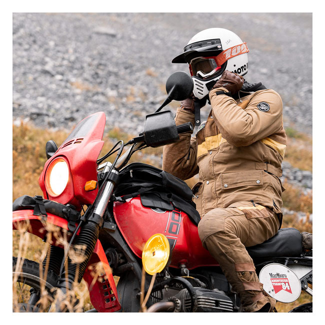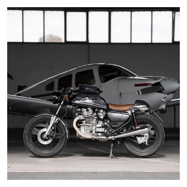 Strong canvas material; finished with genuine aged ranger leather. The bag can be extended to increase its volume; only when required to prevent an unnecessary 'bulky' bag. The touch screen of your device through the 'see-through' PVC window. A total of 8 strong magnets will hold your bag slip-free on the fuel tank. The tank bag is waterproof; through the integrated rain cover. For off-bike use you can use the integrated carrier handle; for more comfort an optional shoulder belt is available as 970952 black or 970953 brown. Dimensions: 31 x 17 x 22cm; extendable to 31 x 25 x 22cm. Capacity: 9 Liter; extendable to 14.5 liter.