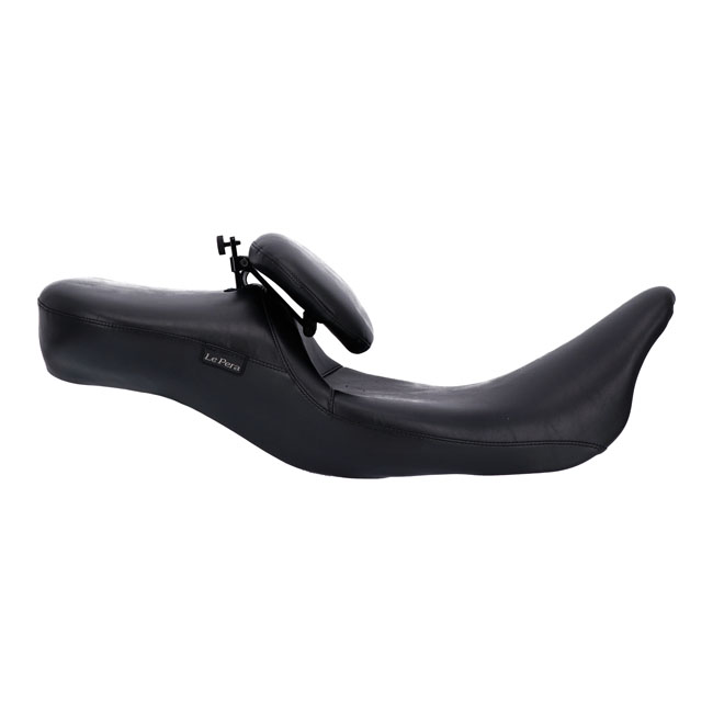 15" wide rider seat area & 13.5" wide passenger seat area. Maverick stitch pattern. With removable backrest. Backrest is easily removed when not required. Comfort based design; which still retains a low and sporty profile; with added comfort from the removable backrest. This 'Daddy Long Legs' version comes with the seating area is positioned 2 inches further backward to accommodate the longer legs of taller riders. Built with LePera's high-density marathon foam filling on a 16-gauge black powder coated steel base plate.
